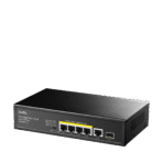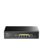 A rack-mounted 5-GbE, 1-SFP PoE switch with a 120W power supply and a silent cooling system.