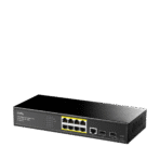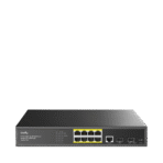A rack-mounted 8-GbE, 2-SFP, Layer 2 PoE switch with a 130W power supply and a silent cooling system.