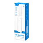 A pole/wall-mounted outdoor 4G CPE with IP65 casing, dual-band WiFi, one SIM slot, and accepting PoE, featuring AC1200 Wi-Fi, Cudy Mesh main node, and VPN features.