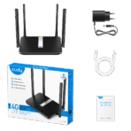 A 4G WiFi router with one nano SIM slot and four Ethernet ports, providing easy-to-install flexible networks for home, office, surveillance, exhibitions, and RV scenarios.