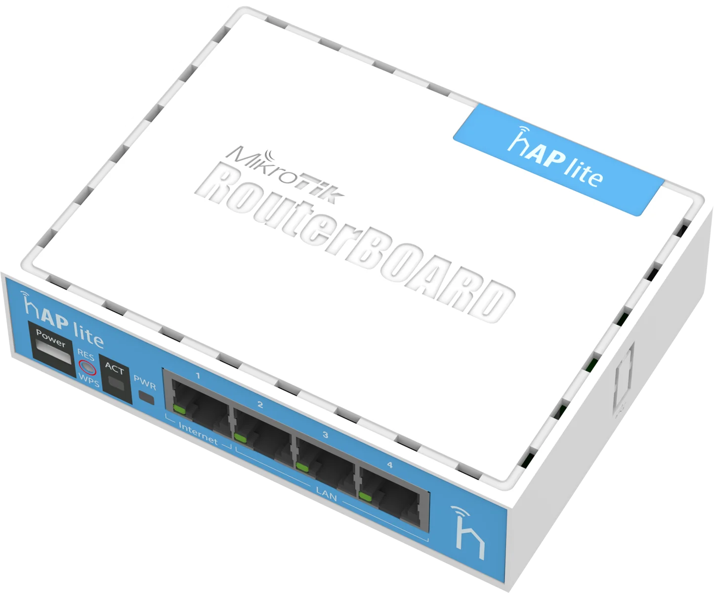 The hAP lite is equipped with a powerful 650MHz CPU, 32MB RAM, dual chain 2.4GHz onboard wireless, four Fast Ethernet ports and a RouterOS L4 license. USB power supply is included.