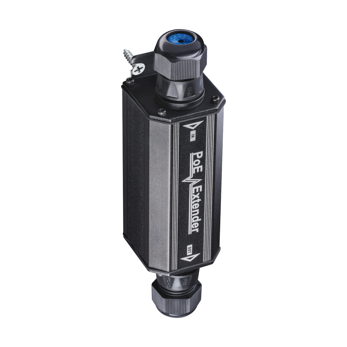 A weather-proof PoE extender that extends the PoE distance by 100m.