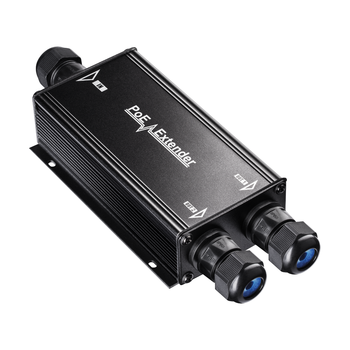 A weather-proof 2-channel PoE extender that extends the PoE distance by 100m.